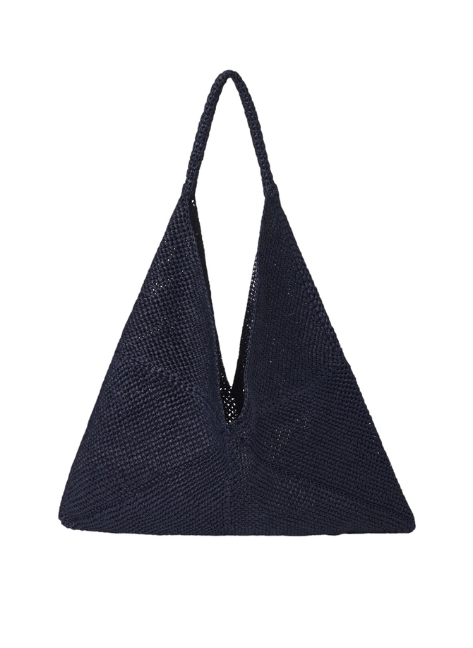 The Sid Bag is crafted from raffia in a deep navy hue. This spacious shoulder bag features a geometrically structured shape with a relaxed slouch, easily transitioning from a shoulder carry to a bold, folded clutch look. The woven tubular handle and unlined construction keeps it lightweight and effortless.