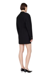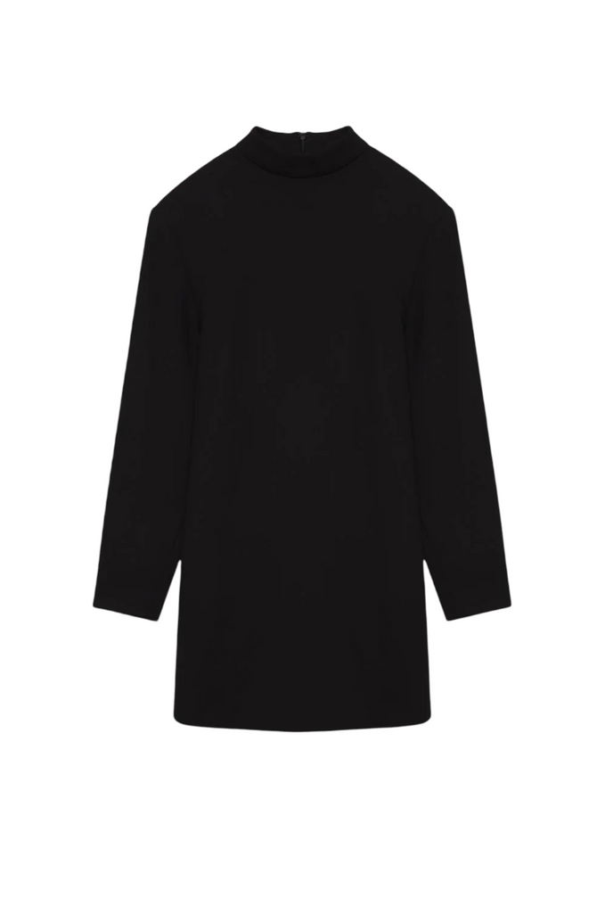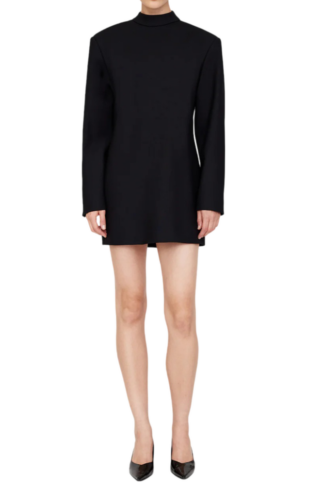 The Adeline Dress is made from a fully lined, midweight stretch-wool fabrication with a structured look and feel. Its intentionally tailored construction features a mock neckline, shoulder pads for an exaggerated silhouette, and a narrow waist emphasized by two back darts. Finished with seasonal gold-tone knot buttons at the cuff.