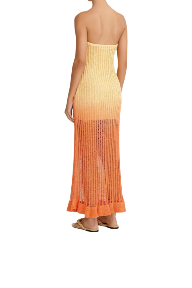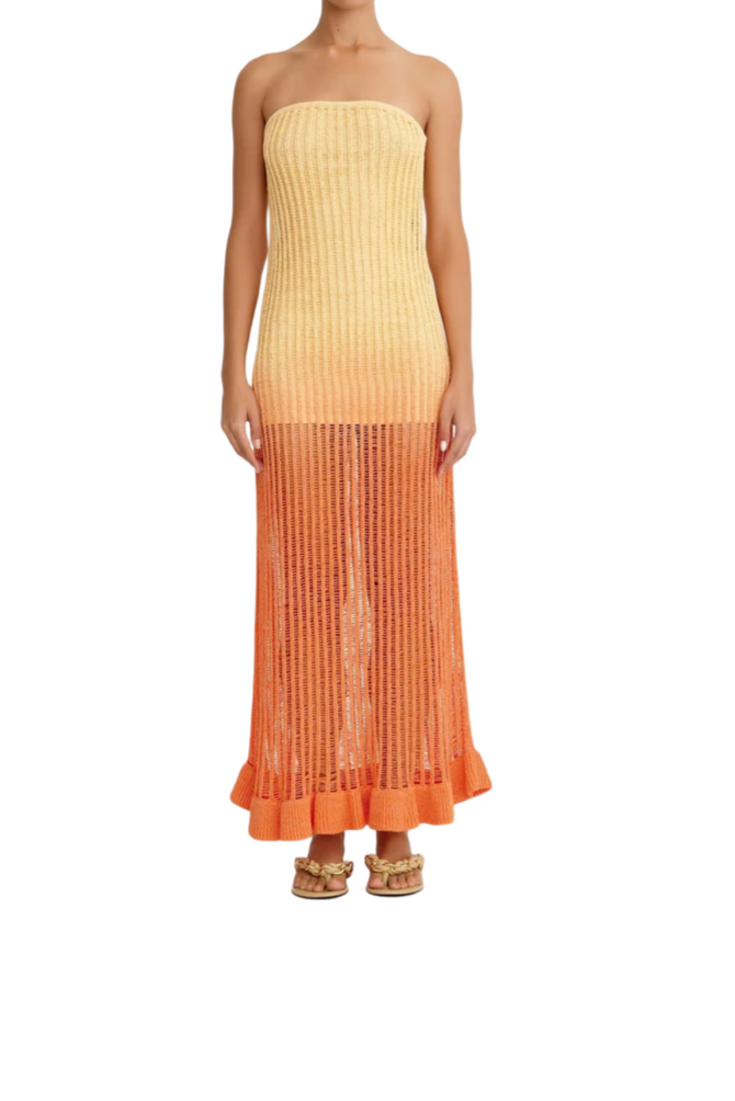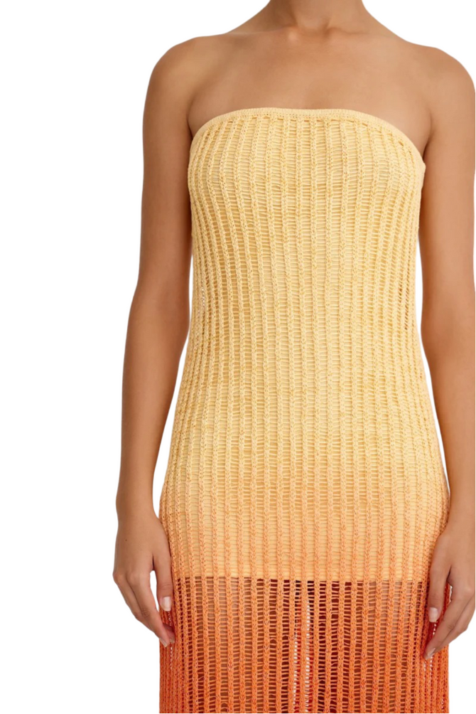 The Amaya Strapless Dress in Horizon is a bold choice for those balmy beachside parties. Crafted from dip-dyed, open ladder stitch knit, this mini-length dress features a flared hem for a playful yet sophisticated touch. Its separate opaque knit lining provides coverage, while maintaining a breezy, lightweight feel.