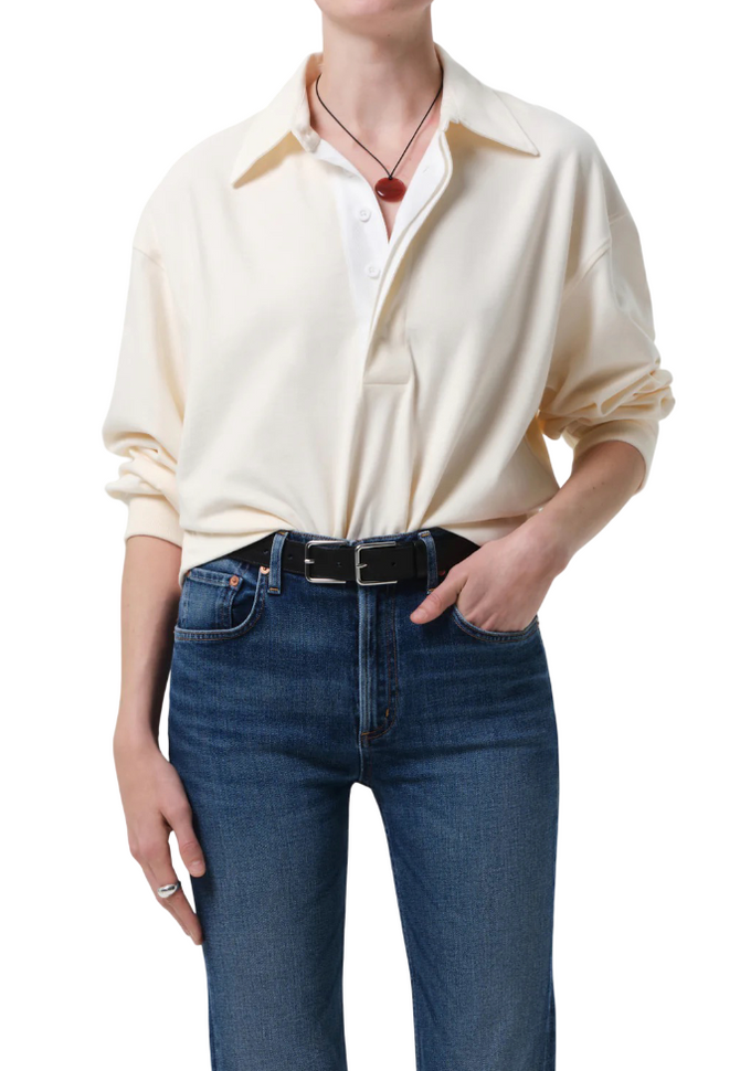 Understated and refined, the Aris Rugby is cut from luxe cotton with an ultra-soft hand. The off-white Pashmina shade pairs seamlessly with a crisp white collar, delivering a clean, tonal take on the classic rugby silhouette. Effortless with vintage denim or tailored separates.