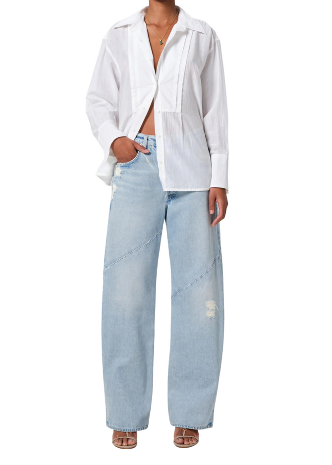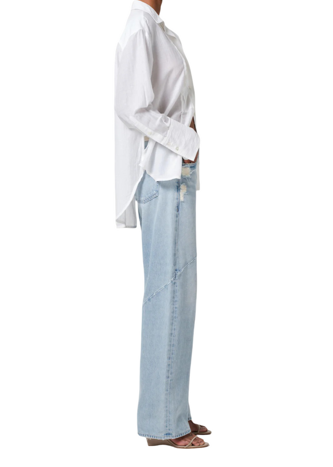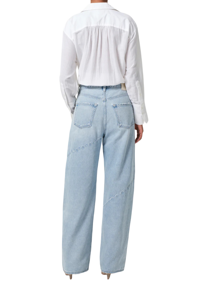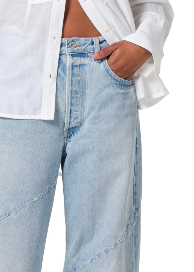 Inspired by a reworked vintage silhouette - our Ayla offers a slightly relaxed but flattering top block into a roomy leg that can be worn cuffed and uncuffed. Light indigo denim wash with distressing and seam detailing. Fits true to size with rigid, non-stretch regenerative soft hand cotton feel.