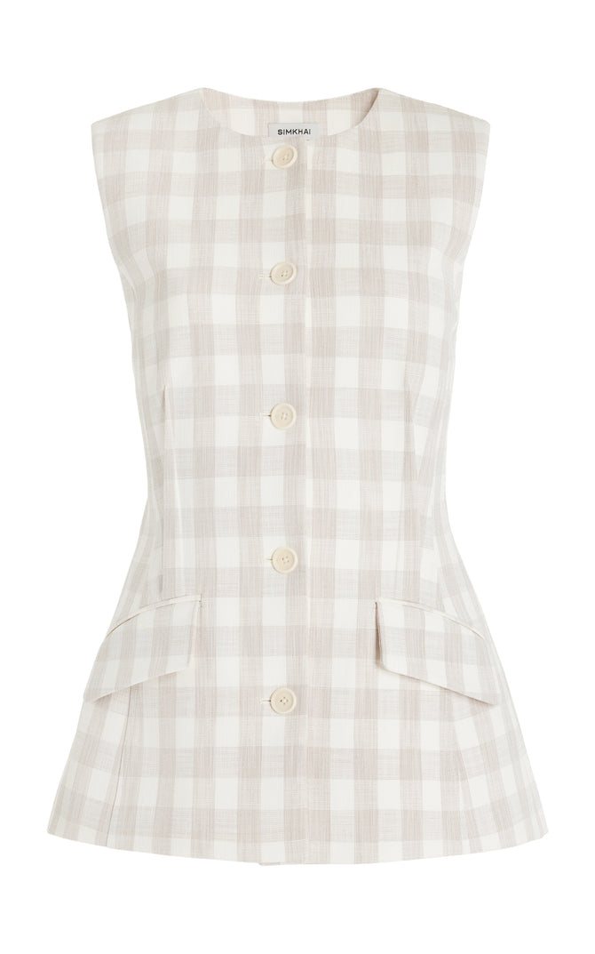 The Calliope Vest in Sand Gingham. This tailored vest showcases a yarn-dyed gingham pattern with structured details and a refined silhouette.