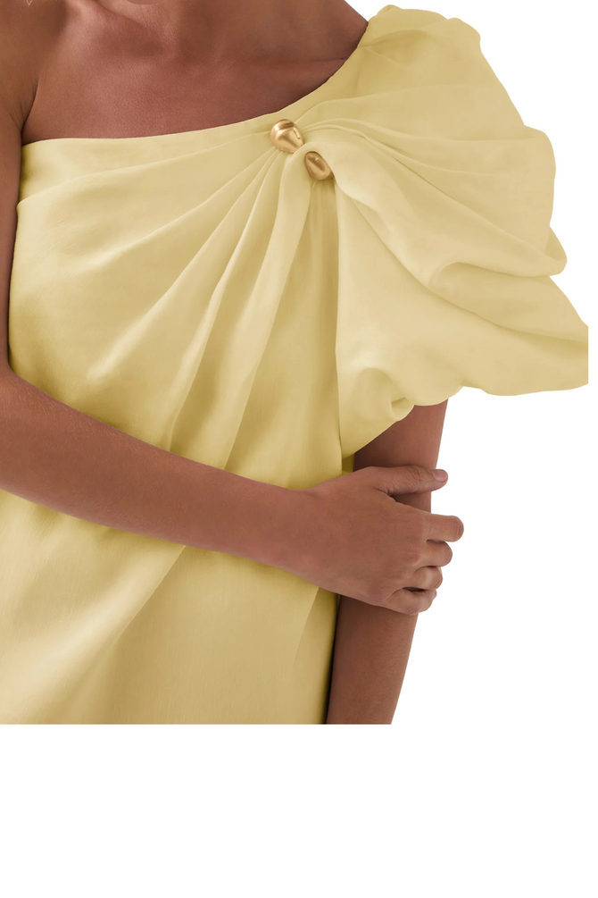 The Cira Mini Dress offers a shift silhouette featuring an asymmetric one-shoulder with hardware detail in a stunning Lemon wash.