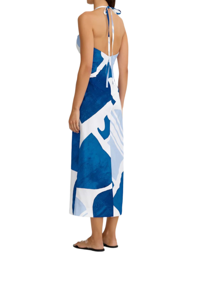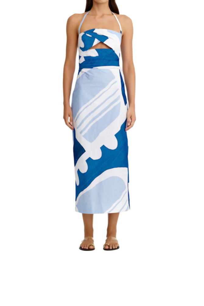 Featuring a unique placement print and crafted from crunchy cotton, the Claire Midi Dress in Printed Shapes boasts a lined bust panel and a sleek design. With halter fabric ties, an under bust cutout, and pleating details, this dress is perfect for making a stylish impression.