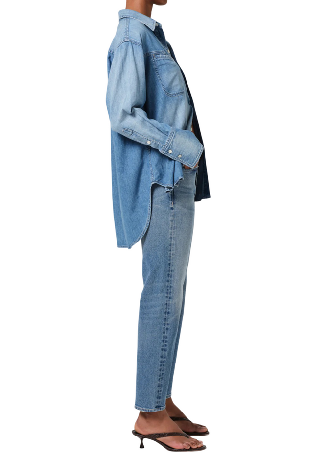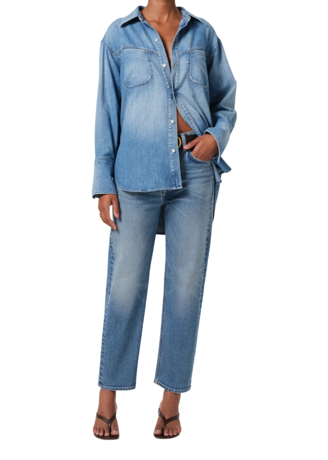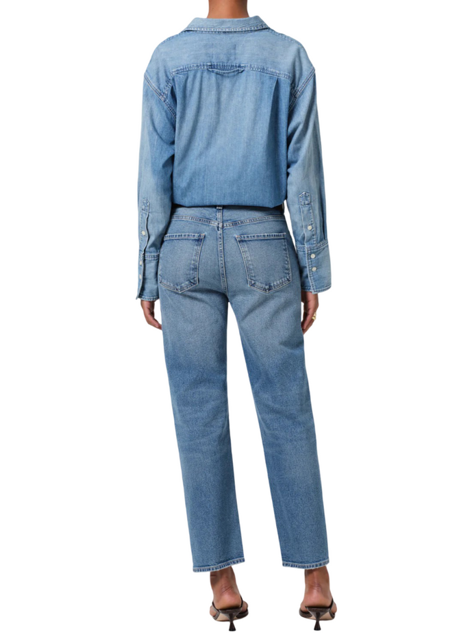 A stretch essential. The Delfina jean features a high-rise and straight fit, designed to be ultra-flattering and all day wearability. Featured in our medium indigo denim with whiskering and fading throughout. Fits true to size.