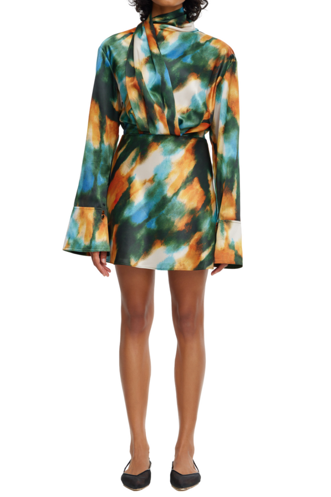 Introducing the Jeffries Mini Dress in Capri Wallpaper, a bias-cut satin printed dress designed for elegant allure. Featuring a draped neckline and a panel over the front bodice, this dress offers a sophisticated silhouette.