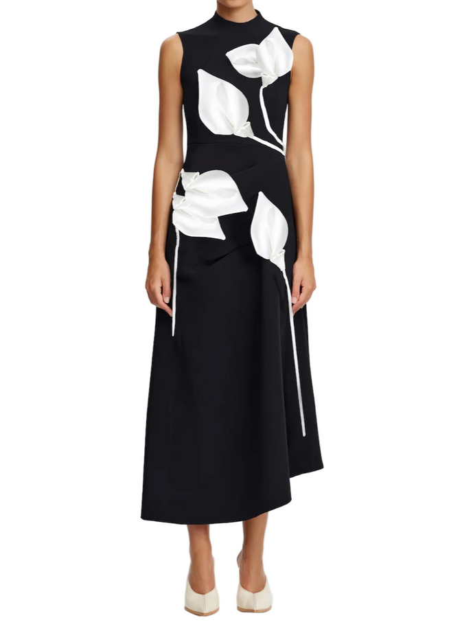 Introducing the Kadence Midi Dress in Black and Ivory, a monochrome moment designed to make a subtle impression. Featuring bold petal appliqué across the front bodice, this high-neck, sleeveless silhouette is grounded in clean lines and strong contrast. An eye-catching choice for formal events or celebrations.