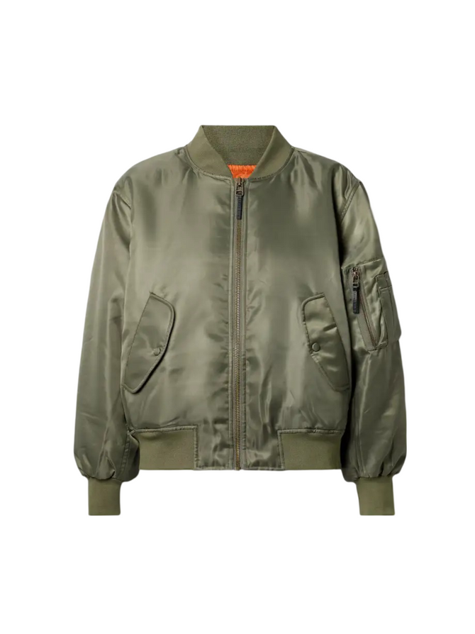 A traditional military-inspired bomber jacket made from a durable, slightly padded 100% polyester shell with a subtle sheen. Features traditional flight jacket details including a bright orange interior lining, two front flap pockets, a zipped sleeve pocket, and ribbed knit trim at the neck, cuffs, and waistband. Finished with a branded vegan-leather zipper pull down the center.