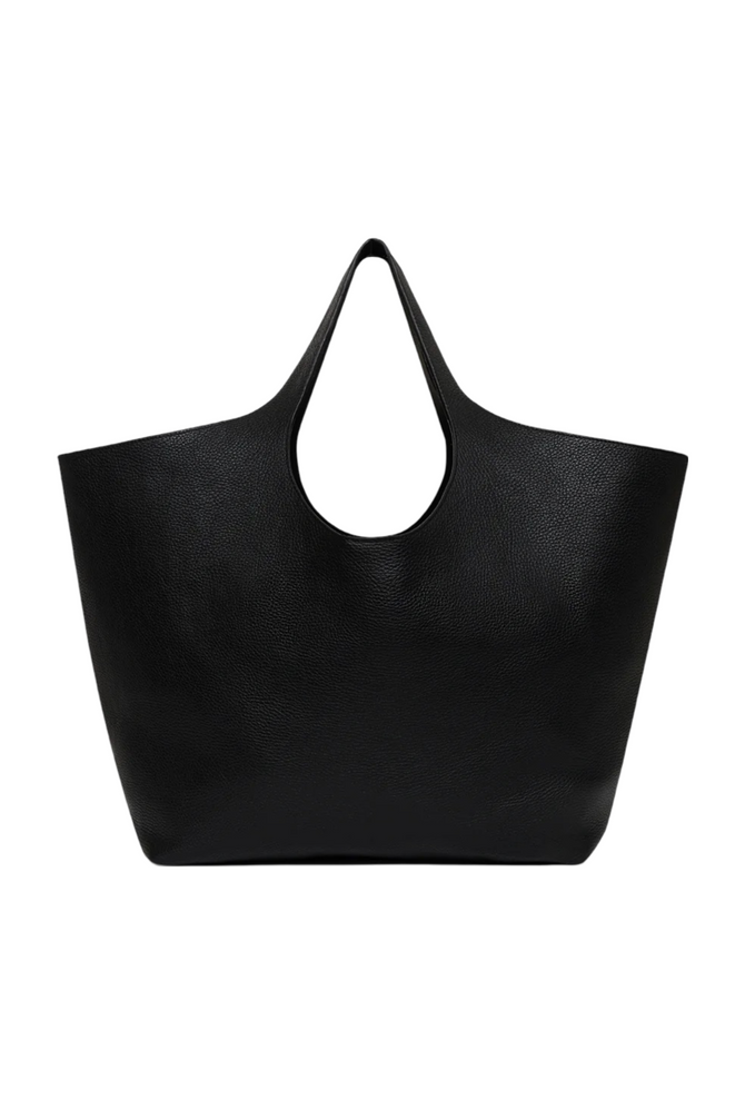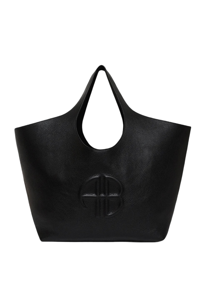 A large tote bag crafted from soft 100% pebbled leather with a matte finish. The Lili Tote includes a magnetic top closure revealing a roomy compartment with bonded faux suede lining. Organize your belongings on the go with a single interior slip pocket and zipper pocket. Finished with our signature embossed ANINE BING monogram at the center front.