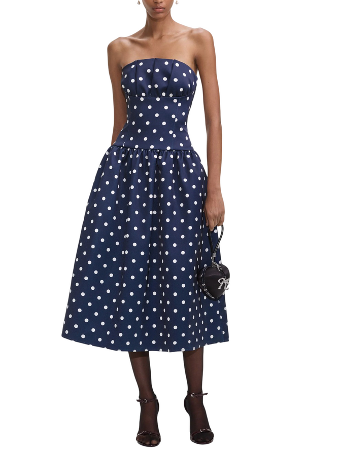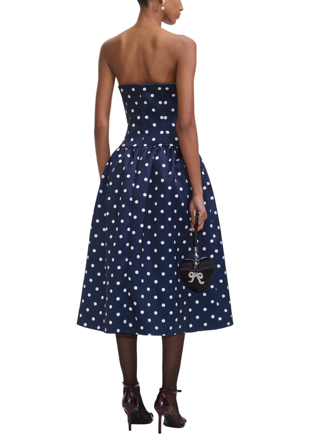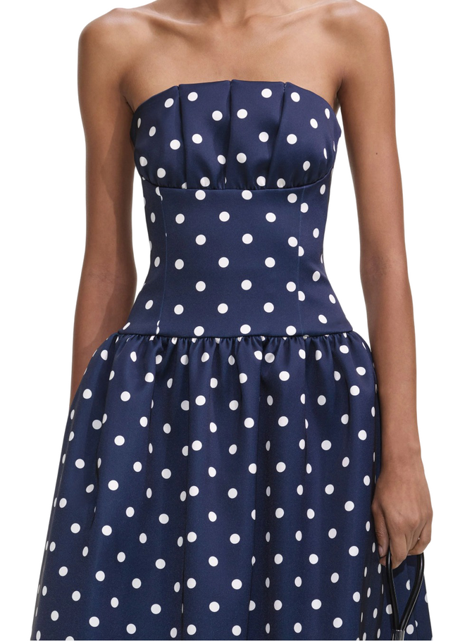 Channel retro chic with this polka dot satin dress. Tailored to flatter, the square neckline features corset and pleat detailing for extra charm. Style with heels to show off its full midi skirt.