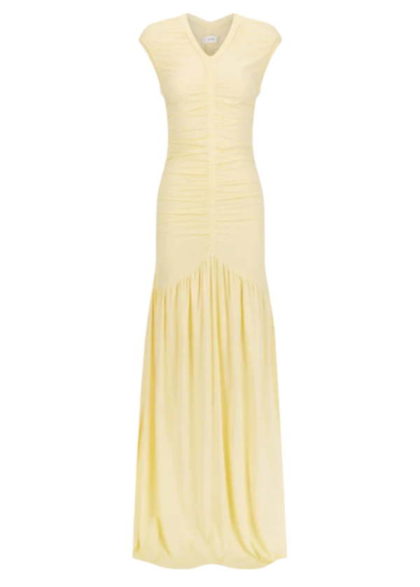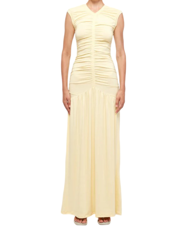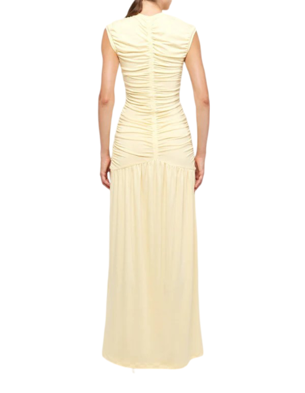 This iconic maxi is defined by dramatic ruching through the body for a split contouring effect. The slim, full-length skirt falls from a long, curved waistline that hugs the hips. Pair with chunky gold jewelry.
