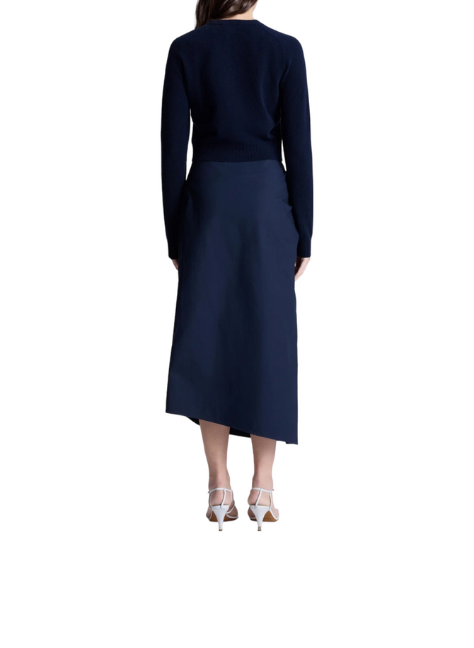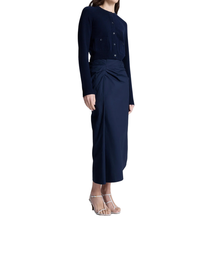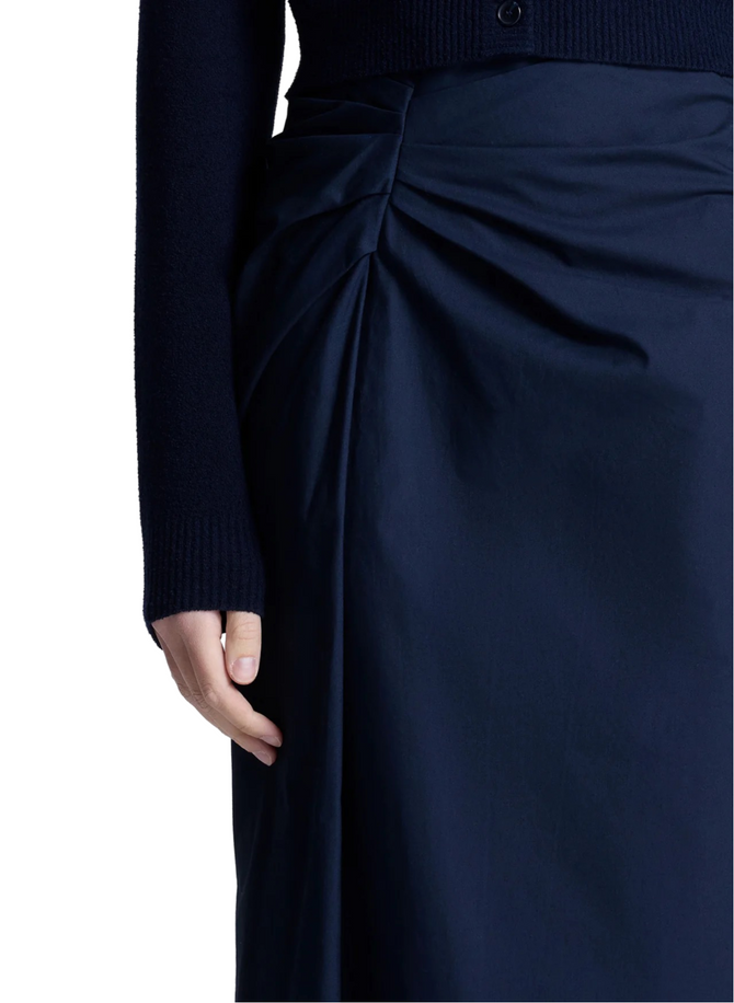 The Tessa Skirt is crafted from polished cotton poplin in deep navy. This midi silhouette features asymmetrical ruched detailing at the hip, adding a modern, sculptural touch for a sophisticated look. Pair with everything from modern tees to knitwear.