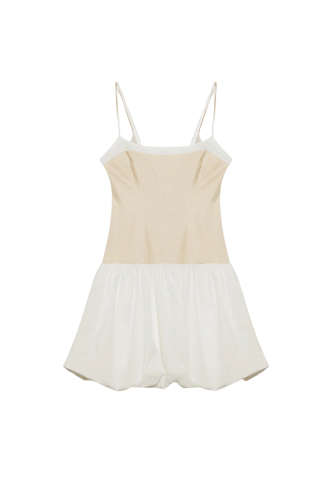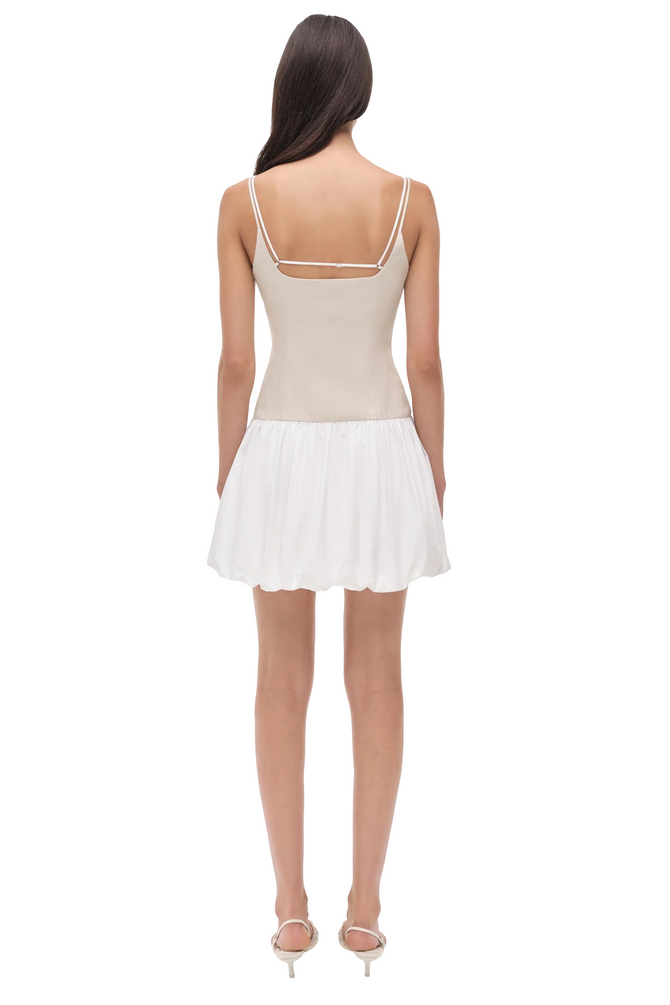 The Fifi Dress in Sand Multi. Crafted with a linen poplin combo, this sleeveless bubble mini dress features a structured bodice and a voluminous skirt.