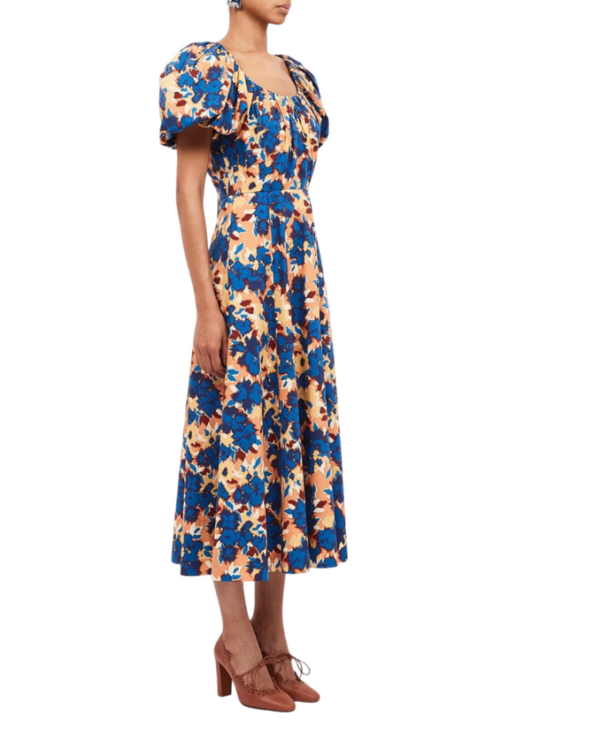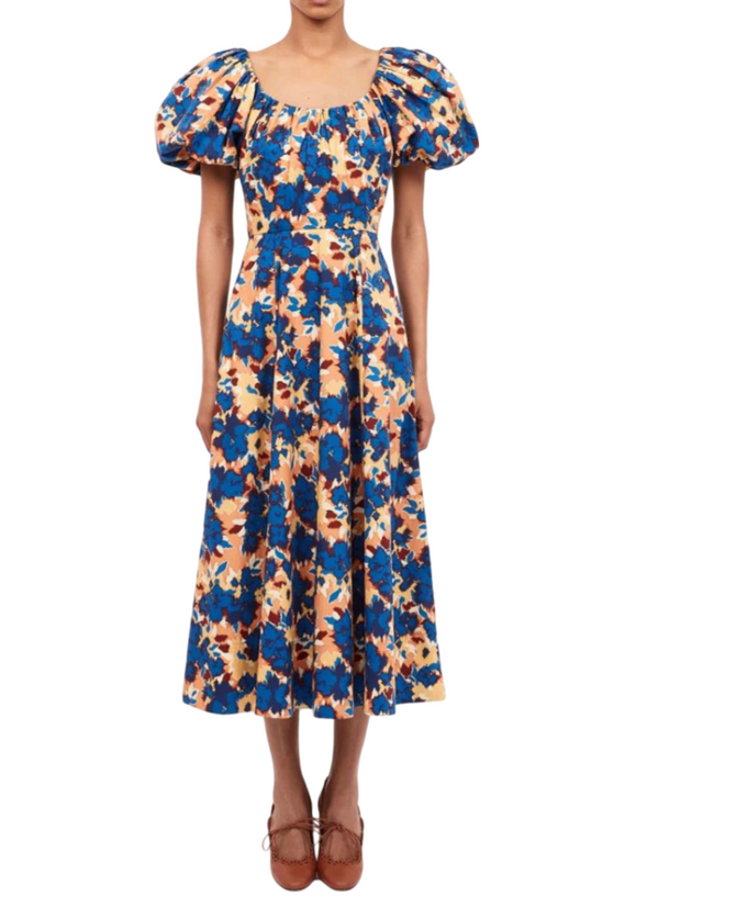 A forever favorite silhouette, the Imara Dress is tailored from crisp poplin that blooms with blurred ikat florals based on hand-painted artwork. Featuring swirling blue and coral hues, this midi style has our signature puff shoulders with gentle gathers at the neckline and a clean A-line skirt. It has side pockets and fastens with a concealed back zipper.