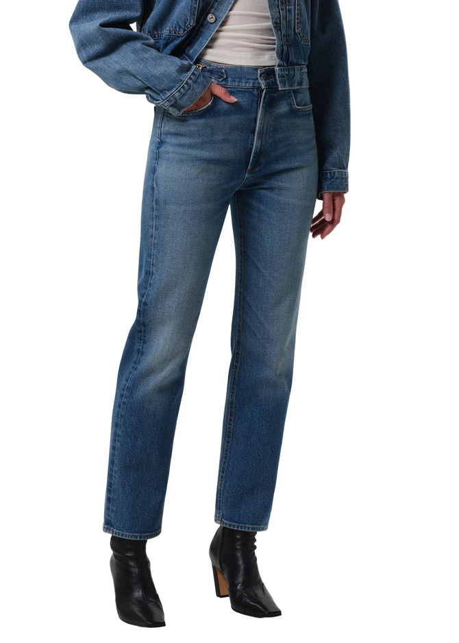 A vintage-inspired straight leg with a refined twist, the Blaine is crafted from comfort stretch denim made with regenerative cotton for all-day ease. Designed with a high rise and ankle-grazing length, it features signature horsebit hardware at the waistband for a subtle nod to equestrian heritage. The Alma wash—a medium indigo with soft fading and whiskering—adds a lived-in feel. Style with a crisp button-down or tucked knit.