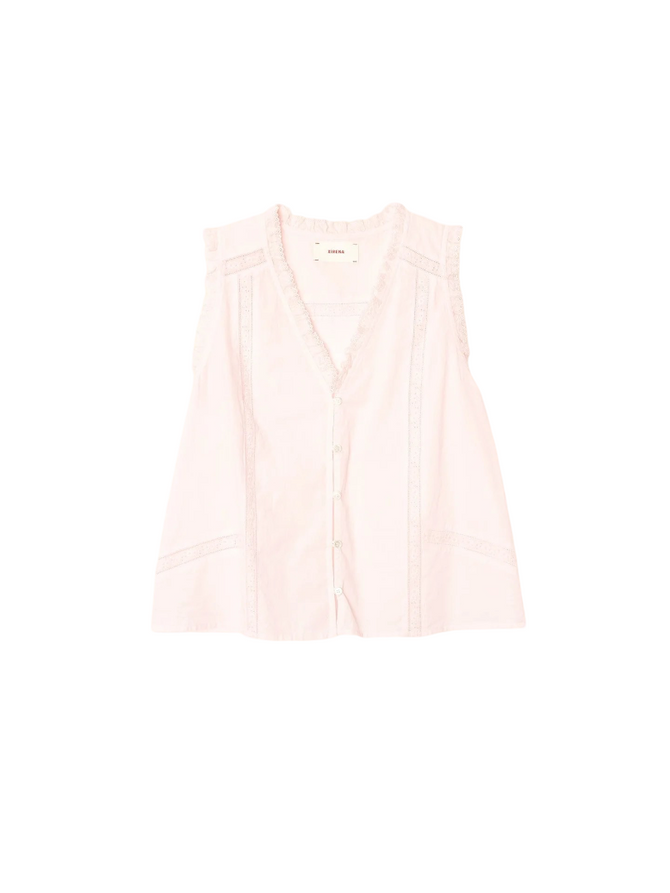French allure meets California ease. Louise is made in our classic lightweight woven cotton poplin for a lived-in look and feel. This femme tank features a rouleau button-front, embroidery trim throughout, and soft ruffle details. Fits true to size.