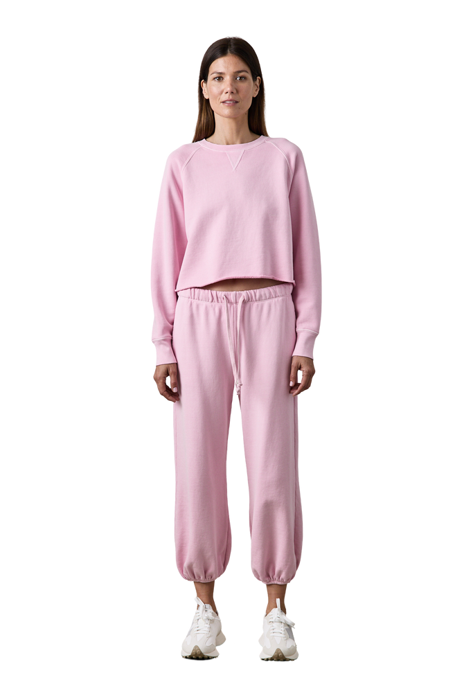 Drawing inspiration from a classic menswear raglan crew-neck sweatshirt, this piece features a raw-cut hemline that adds a touch of edgy femininity. The relaxed silhouette perfectly blends traditional structure with modern boy-meets-girl style.