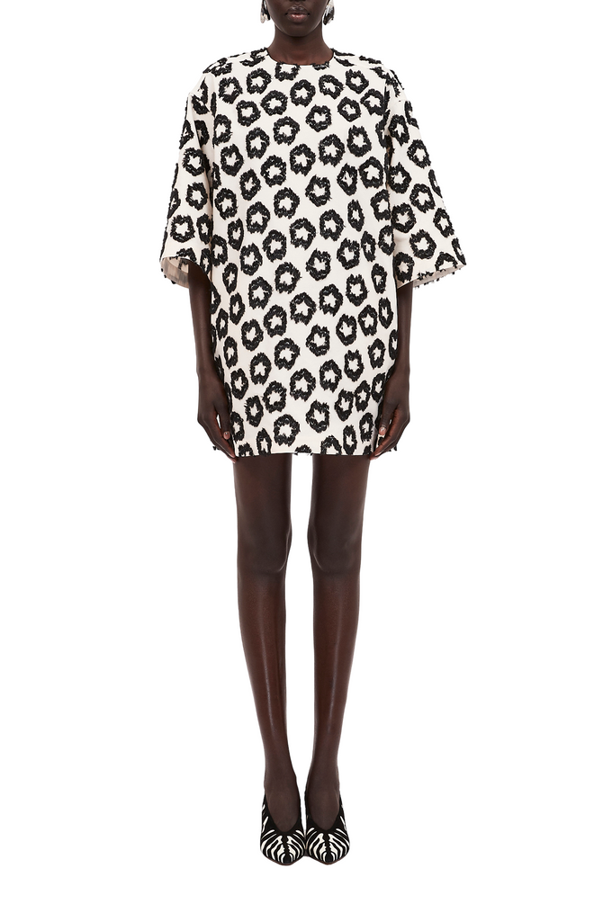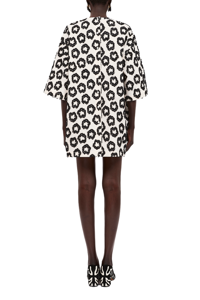Gracefully oversized, this black and white style has short sleeves, side pockets, and can be worn as a playful mini dress or layered with our coordinating Cai Pant. It fastens with buttons through the back.