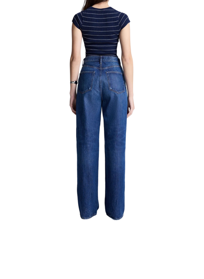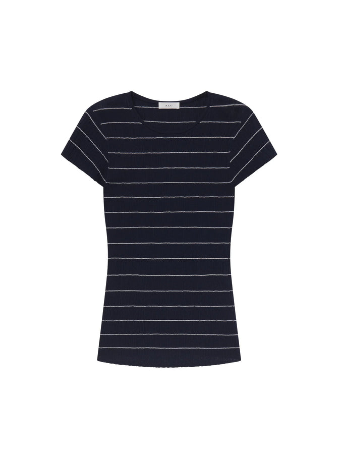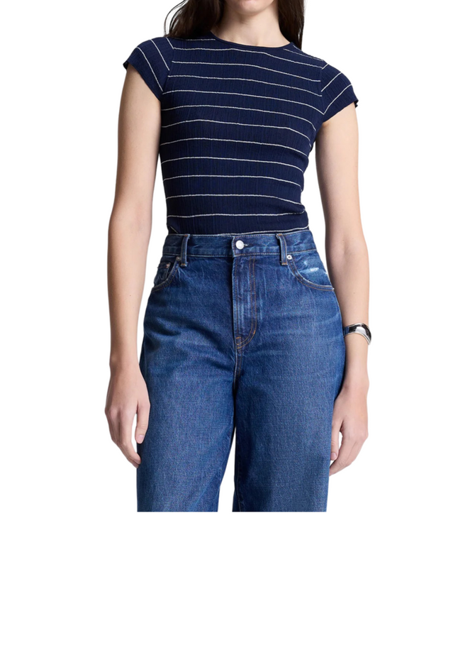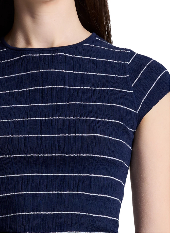 The Sam Top is knitted from fine-gauge cotton-blend yarn in rich navy with thin white stripes. This fitted silhouette features a high round neckline and cap sleeves, lending a textural touch to any look. Pair with everything from denim to tailoring.