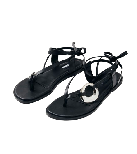 The Morosia sandals feature thin black leather thong straps that elegantly wrap around the ankle, offering a customizable fit. A single silver hardware piece adorns one of the straps, adding a refined and minimalist touch.