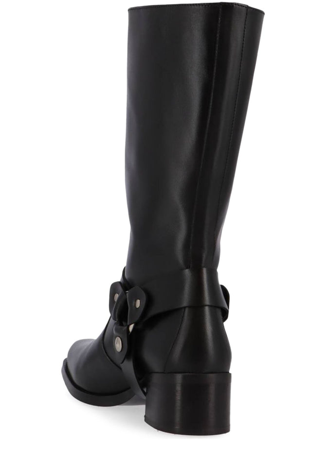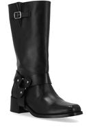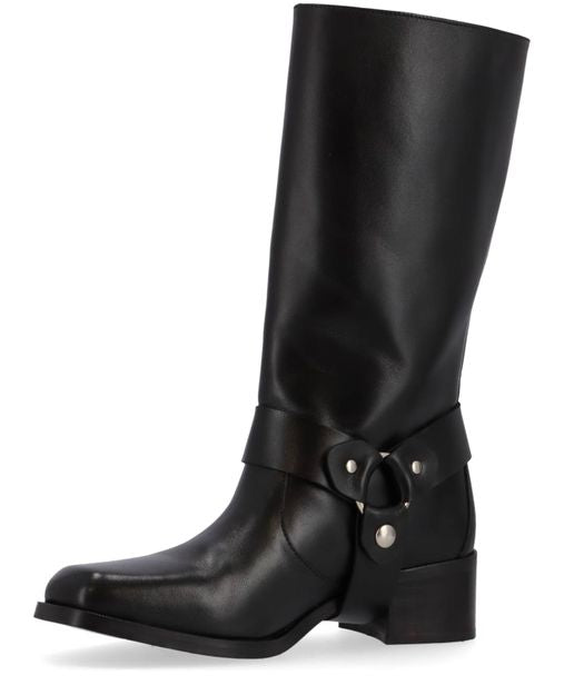 Made from black leather with a polished finish, the Rocky biker boot is all you’d expect in such a shoe, featuring a low chunky heel, buckles, and riveted straps. Wide enough to fit comfortably around the calf, you can wear yours with anything, from bare legs to leggings to wide-bottom pants.