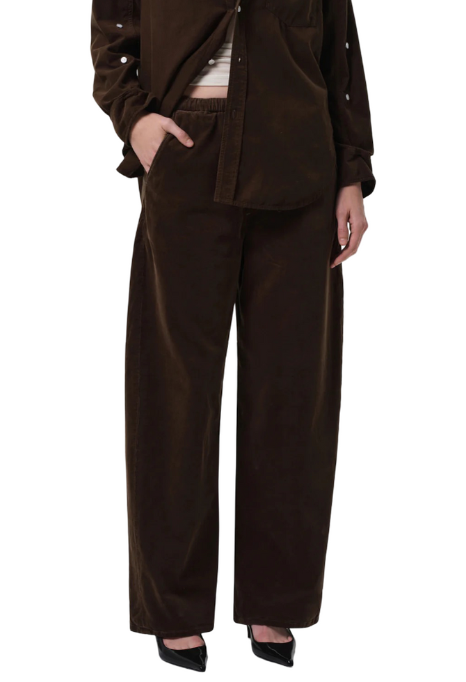 Crafted from soft, stretch baby corduroy with a subtle ribbed texture, the ‘Aurora’ pant is designed for ease with a high-rise drawstring waist and wide leg. The ‘Costes’ shade—a deep, earthy green—adds richness and depth to the relaxed silhouette. Style with tonal knits or a crisp poplin shirt for an elevated everyday look.