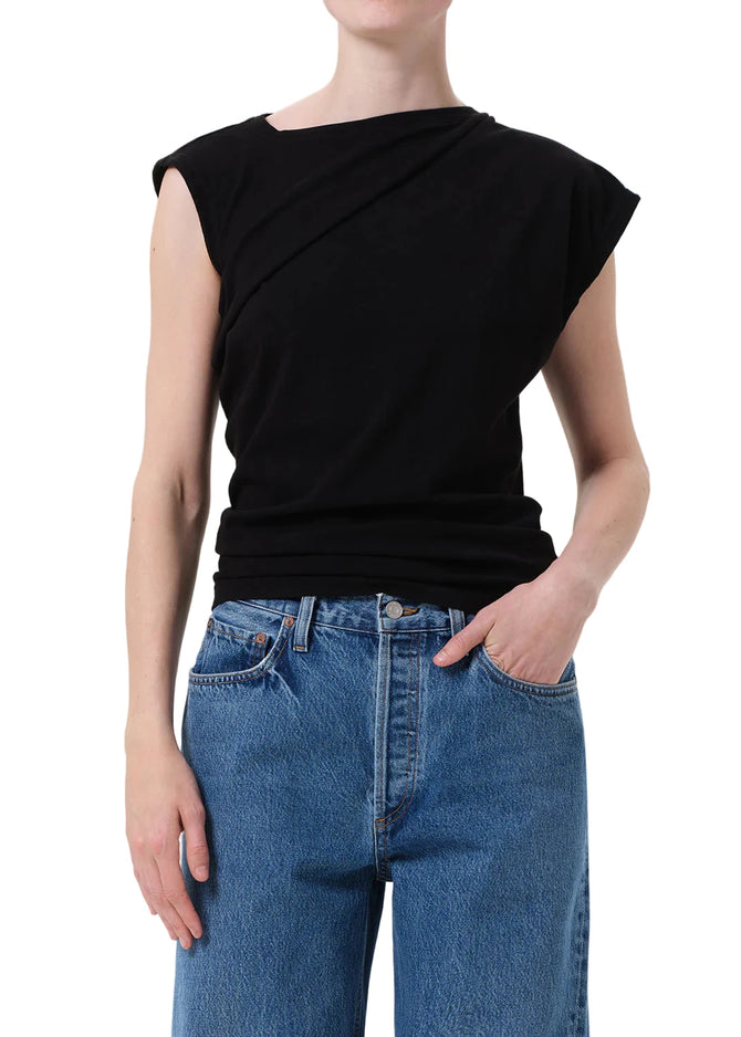 The Beth Tee features an asymmetrical neckline and cap sleeve for a subtle twist on the everyday tee. Cut from lightweight, ultra-soft organic cotton jersey in true black, it’s both minimal and elevated. Pair with high-rise denim or trousers for a clean, modern look.