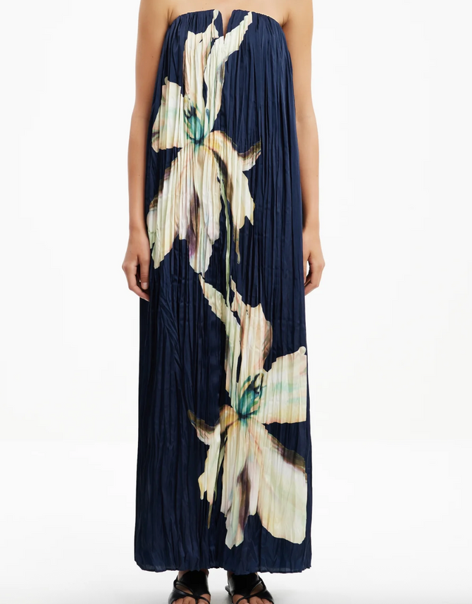 Bold yet effortless, the Lilian Maxi Dress in Midnight Lilium is designed for relaxed celebrations. Featuring a structured strapless bodice and flowing pleated fabrication, this style skims the body in all the right places. The placement floral print and soft crinkle texture add dimension making it perfect for long lunches, garden weddings or summer evenings.