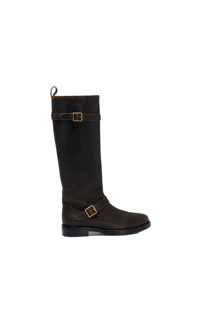 Crafted in smooth leather, this knee-high boot features a clean, structured silhouette adorned with two adjustable buckle straps. A low stacked heel and rounded toe keep the design timeless and versatile.