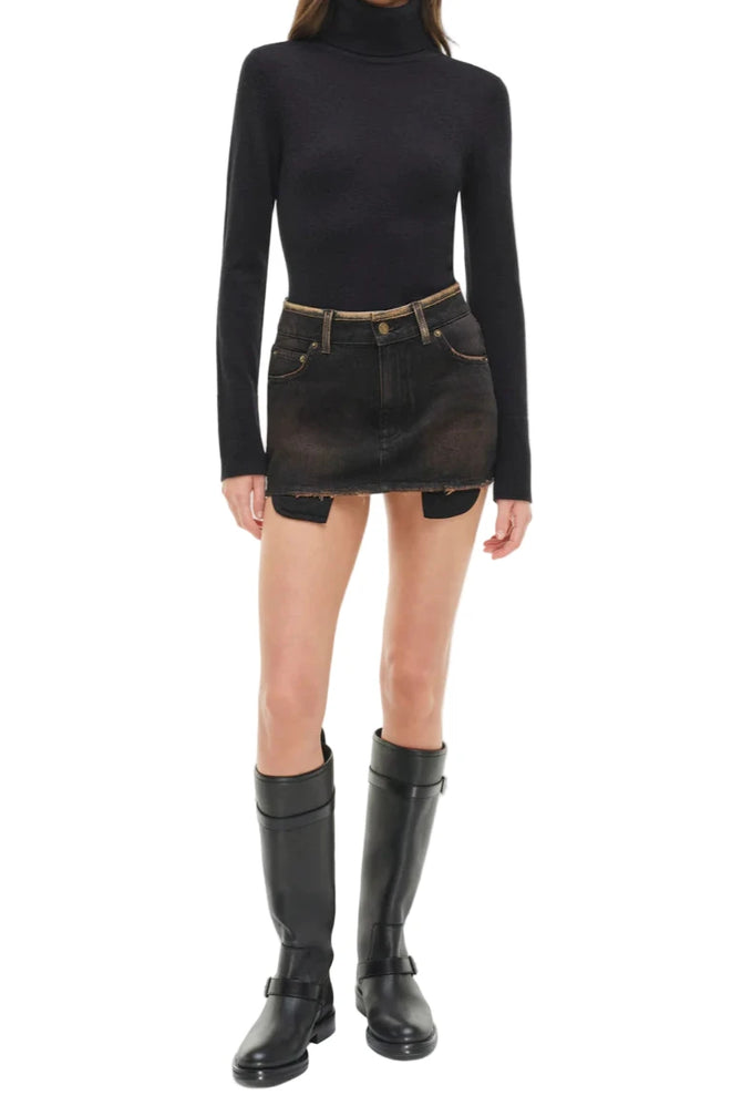 A denim mini skirt that features leather details, exposed pockets, and a raw edge hem.