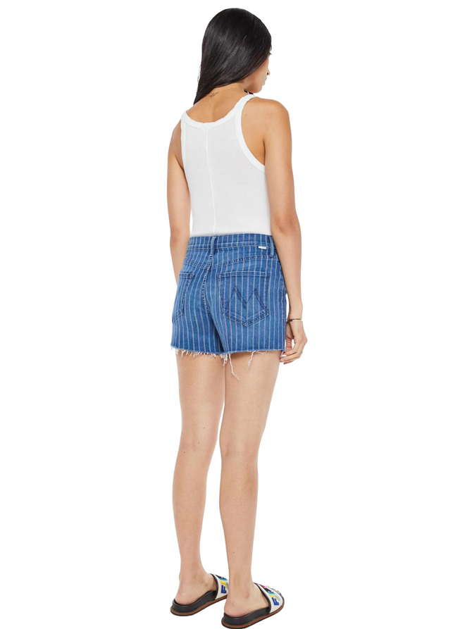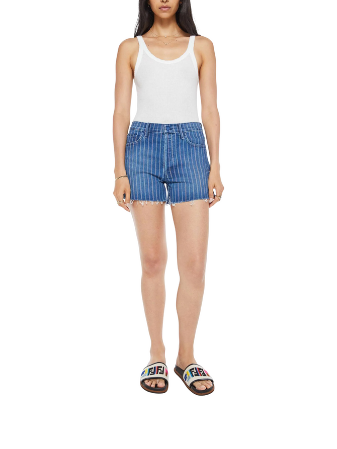 Sun's out, shades on. High-waisted denim shorts with a button fly, frayed hem and vintage-inspired fit. Cut from stretch denim, Sunglass Strolling is a mid-blue with vertical stripes and subtle fading.