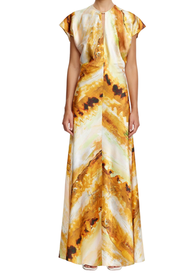 The Yarrow Maxi Dress in Opal Abstract is a striking silhouette infused with contemporary detail. Crafted from satin woven fabric, this maxi dress features a bloused bodice and straight skirt, enhanced by a unique print cut on a chevron shape for visual impact. A polished hardware accent at the neckline adds a refined touch, while the back invisible zip ensures effortless wear.